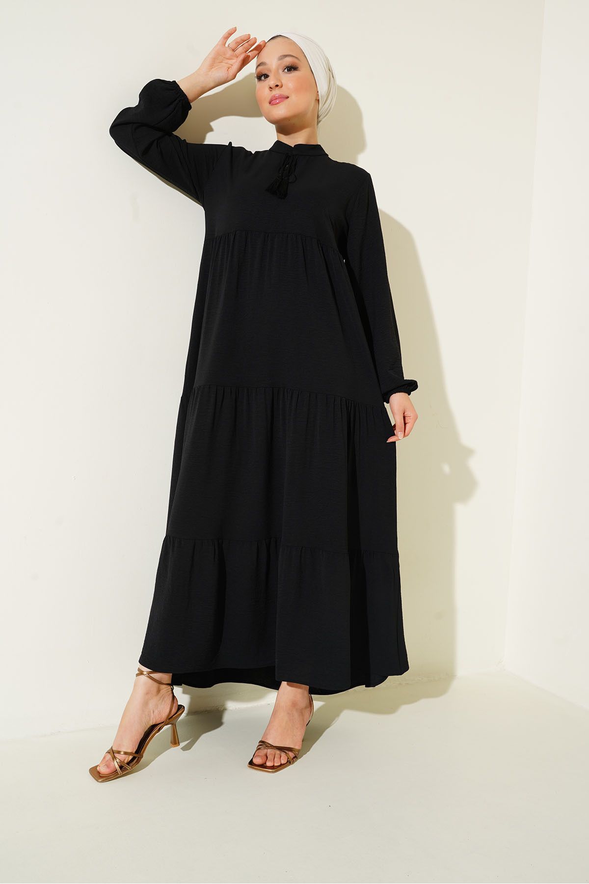 1627 Yaka Bağcıklı Tesettür Elbise Ramazan Koleksiyonu - Siyah