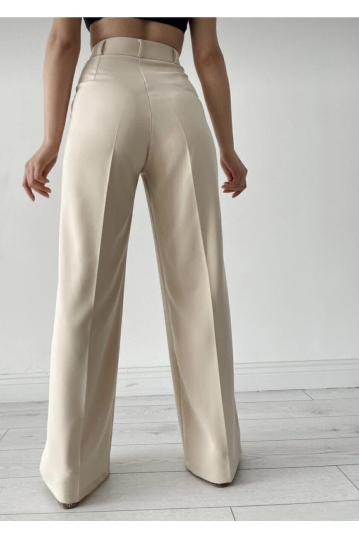 Kadın Bej Pileli Yüksek Bel Palazzo Pantolon