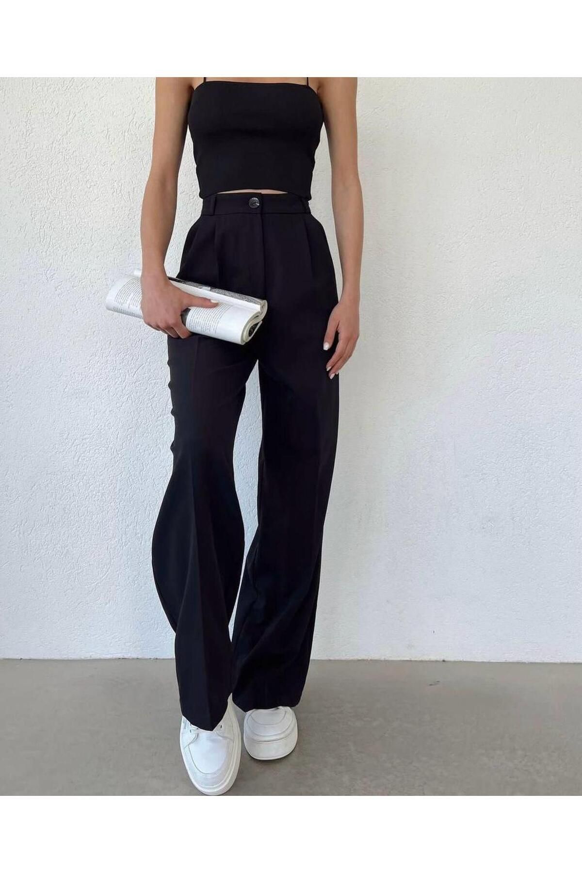 Kadın Siyah Yüksek Bel Pileli Palazzo Pantolon..